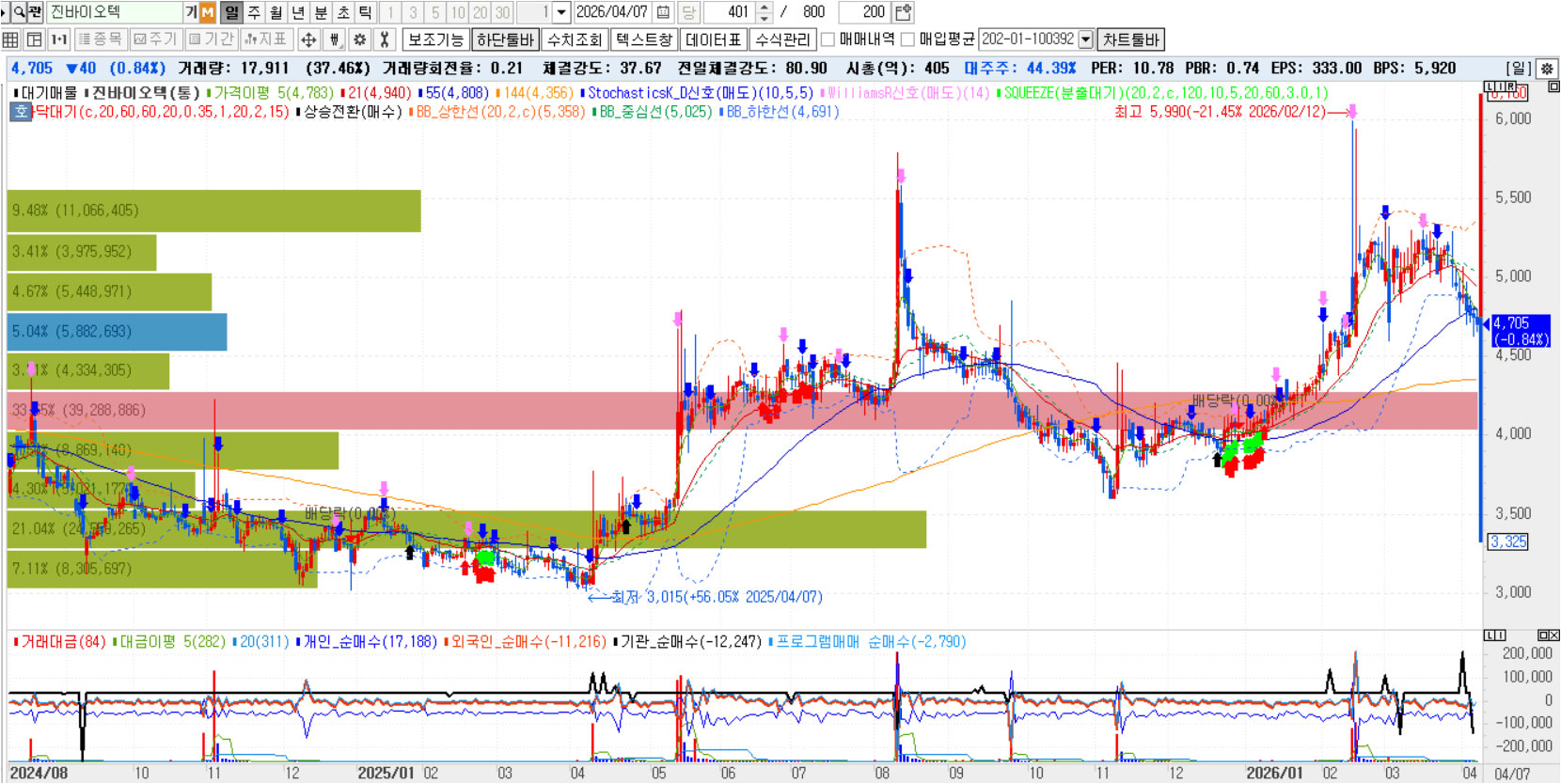첨부된 수급 및 거래량 데이터를 기준으로 보면, 진바이오텍은 현재 단기 숨고르기, 중기 추세는 아직 살아 있는 자리로 해석됩니다.