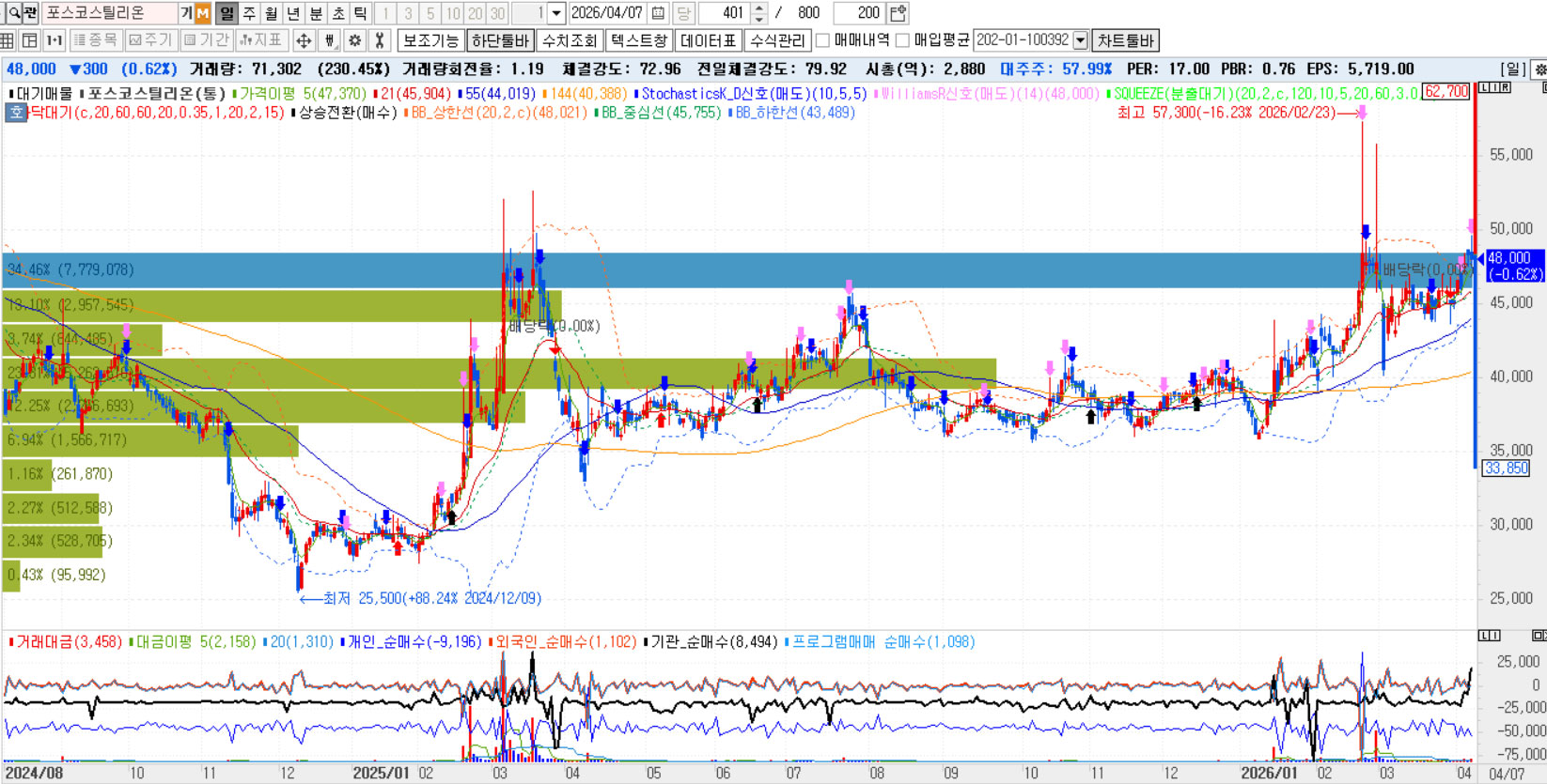 | 최근 20거래일 | 45,200원 → 48,000원 (+6.2%) | -11,632주 | +13,834주 | 변동성 매매 |