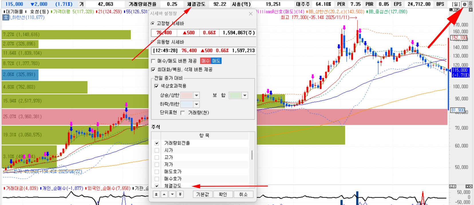 차트에서 우측 끝에 톱니바퀴 설정에서 체결강도를 선택하여 차트 상단 화면에 노출